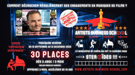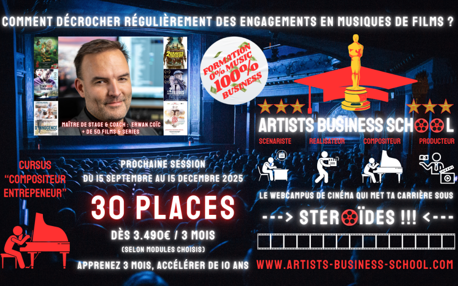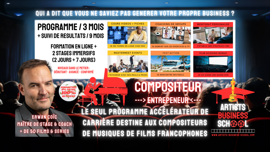 L'école n'ayant que 30 places disponibles pour le cursus "Compositeur Entrepreneur", n'hésitez pas à réserver le plus tôt possible directement en me contactant ici. Les places partiront assez vite dès que le Festival de Cannes sera passé et que les élèves actuels auront bouclé leur session.